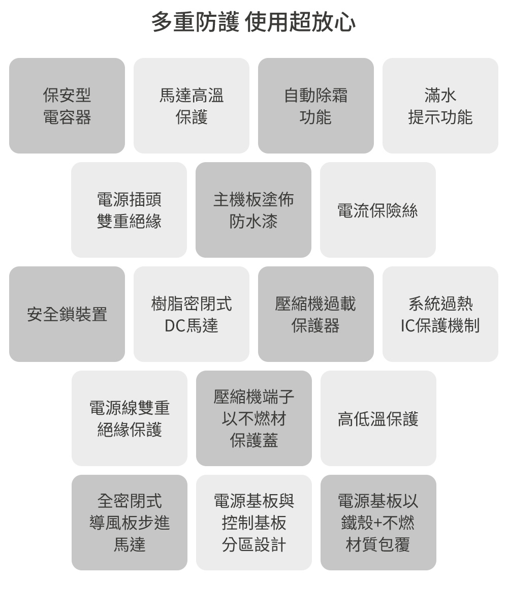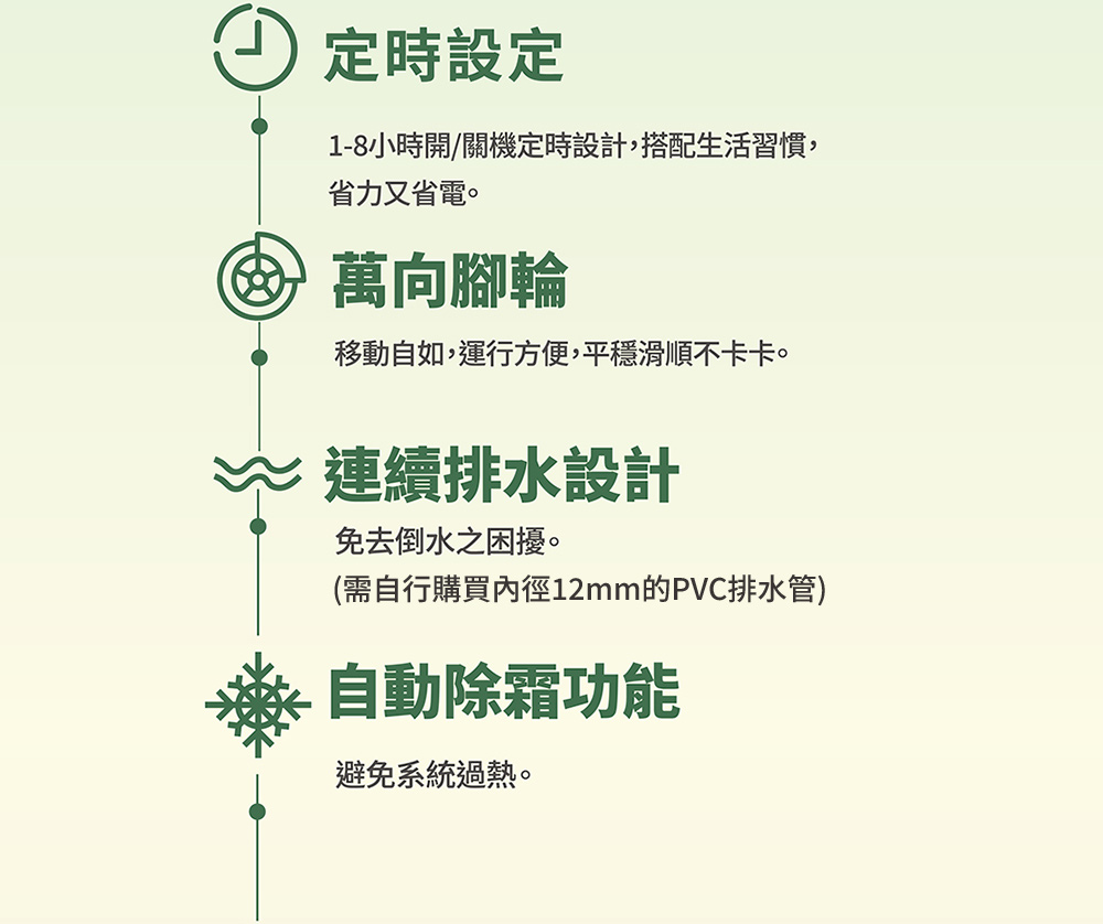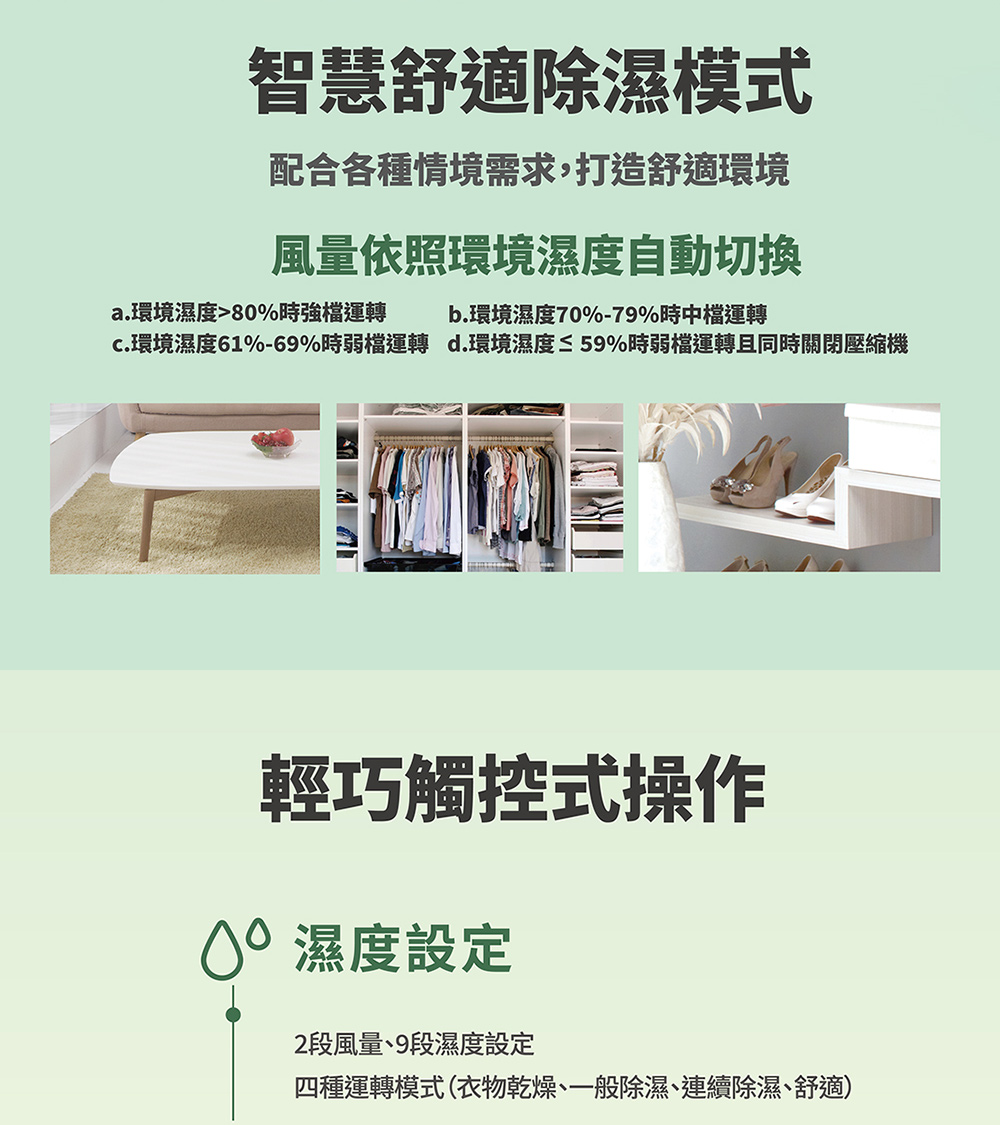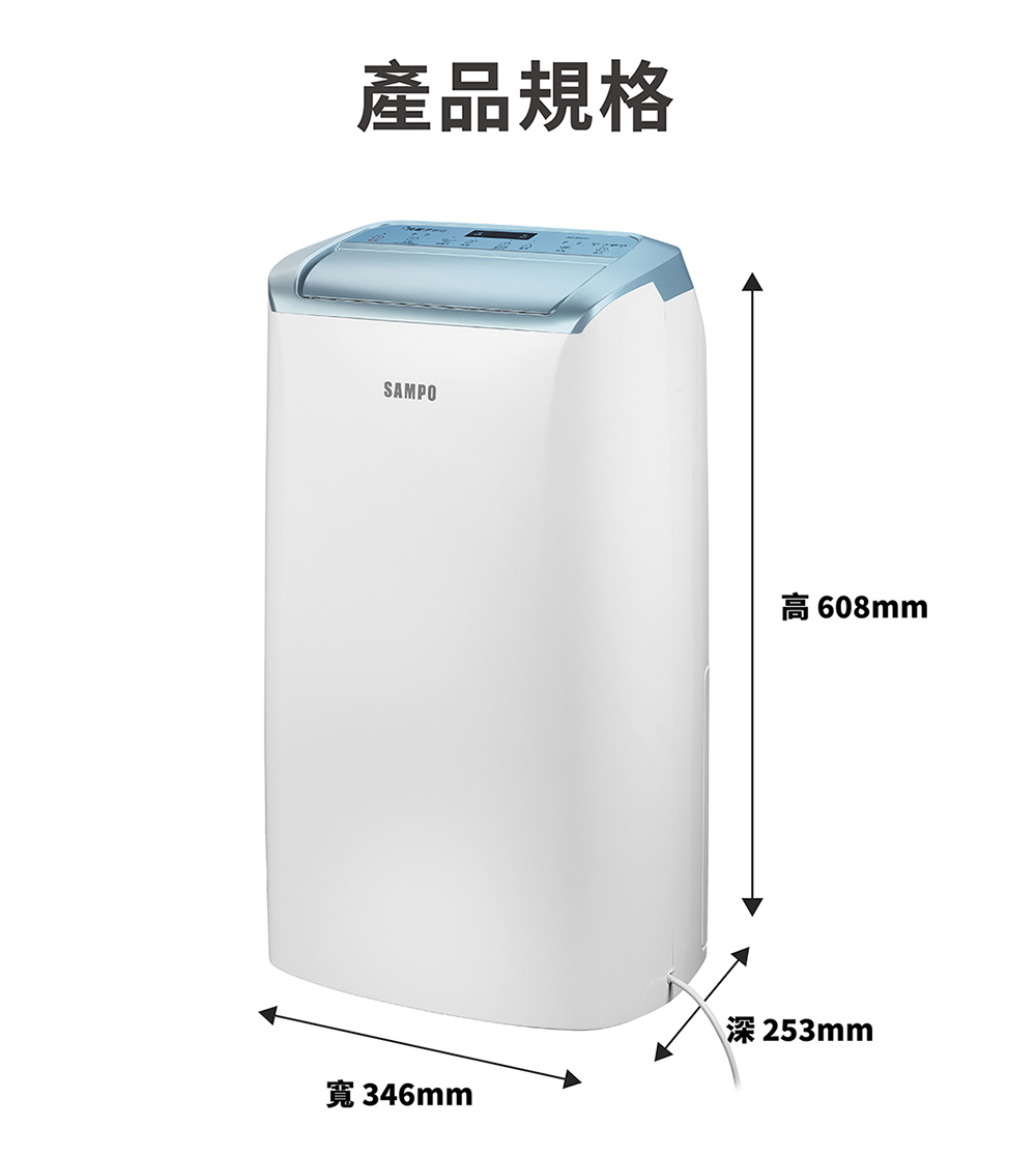 微電腦控制面板 負離子淨化 自動除霜 萬向滑輪、兒童安全鎖 迴轉式壓縮機 自動導風板 甲殼素濾網、夜間模式 除溼能力10.5L(日) 4.0L水箱(水滿3.8L) 1-8小時定時設定 9段濕度設定、強弱風速 智慧乾衣、舒適模式