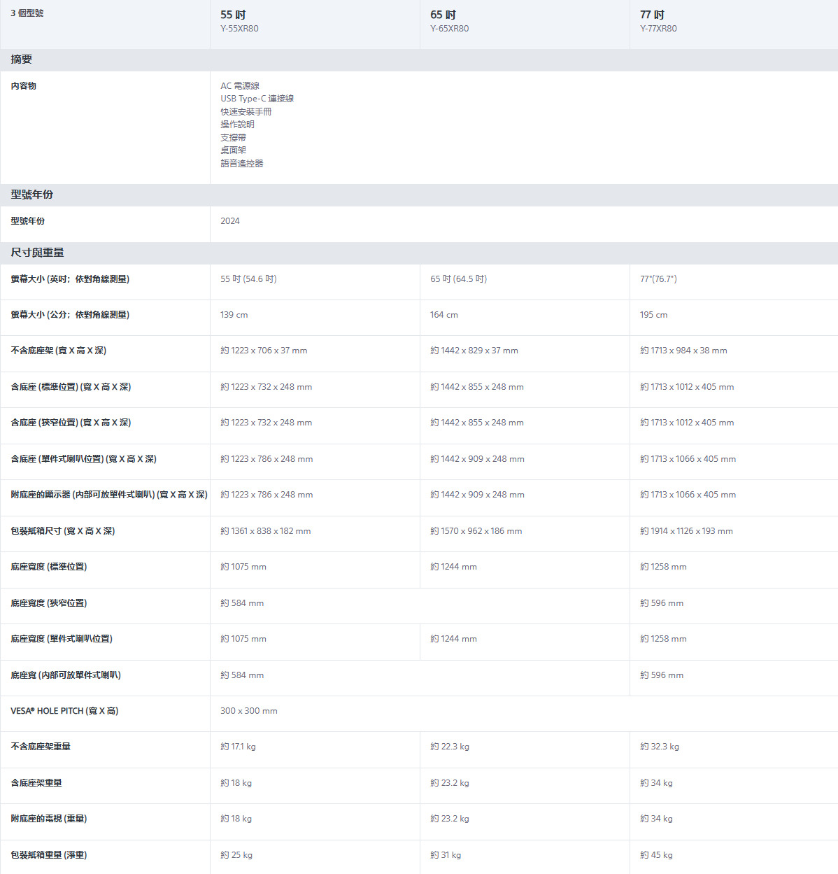 纖薄一體成型 美觀無處不在BRAVIA 8XR 認知智慧處理器全新場景辨識演算法每秒交叉分析數十萬種不同元素精準辨識並優化畫質 實現終極的影像真實感SONYXR360 空間音場實現家庭影院身歷其境的沉浸體驗360 SOUNDMAPPINGBRAVIA 與 Soundbar 系統完美結合搭配指定的 Sony Soundbar 可增強中央聲道實現更清晰的聲音定位與人聲對話AcousticCenter SyncSony 獨家的  聲源解析技術實現更清晰的對話全新 Voice Zoom 3 功能可檢測並增強人聲 實現更清晰的對話你喜歡的娛樂有 Google 小幫手就更完美了擁有超過 40 萬部電影和電視劇直播節目超過1萬個應用程式可供選擇Google TVprimeFor  Movies Shows Apps LibraryGoogle TVThe Wheel of TimeTrending The Dragon Reborn faces his destiny as the Last  approachesTop  for youYour MargaretYouTubeNETFLIXprime videomaxYouTube專業電影工作室校正實現「創作者意圖」的畫質模式NETFLIXprime videoSONYPICTURESCORENetflixPrime Video自適應校色模式校正模式SONY PICTURES CORE校正模式SONY PICTURE CORE可選擇兌換 10 部電影享有長達 24 個月的無限制電影串流服務SONYPICTURESCORESPIDER MANACROSS THE SPIDERVERSEAvailable now on SONY PICTURES CORE  TM 2024 MarvelPurchase an eligible TV and register for SONY PICTURES CORE by February 23, 2026 to be eligible for promotion offers Available movies subject to change. Terms and conditionsapply, for more details see https://www.sony.net/sony-pictures-core 2024 Layout and Design Sony Pictures Home Entertainment Inc. All Rights Reserved業界最頂級影音規格標準沉浸式電影體驗支援杜比視界與全景聲音效IMAX Enhanced 以及專業電影工作室校正ENHANCEDDOLBYVISION ATMOS4段式可調整底座設計4段式調整 巧妙地適應您的設計需求底座安裝在兩側底座調整在中間升高底座搭配 SOUNDBAR底座在中間搭配 SOUNDBAR 與墊片將您喜愛的智慧型手機內容放大數倍輕鬆快速地從您的  或 Android 裝置將喜愛影片、相片、遊戲等更多內容投放到大螢幕上Works withChromecast built-inApple AirPlayDolby Vision 遊戲體驗輕鬆存取遊戲設定遊戲選單集結所有遊戲畫質設定和輔助功能 2024 MARVEL畫質模式減少動態模糊黑色均衡器螢幕尺寸螢幕尺寸設定多重檢視標準全螢幕YouTube快速搜尋MARVELSPIDER-MAN 2十字瞄準線十字瞄設定類型視覺效果和使用者介面為模擬畫面。拍攝 PS5®畫面,混合遊戲實況場景及遊戲內過場動畫。部分功能未來韌體更新提供。© 2024 Sony Interactive Entertainment LLC. 由 Insomniac Games,  開發。遊戲選單 2.0多重檢視功能 輕鬆掌握戰局玩遊戲同時觀看 YouTube 的攻略影片讓您恣意暢玩不卡關 PlayStation 5YouTubeControl this screen混音 全螢幕 2024 MARVEL視覺效果和使用者介面為模擬畫面。拍攝 PS5®畫面混合遊戲實況場景及遊戲內過場動畫。部分功能未來韌體更新提供。© 2024 Sony Interactive Entertainment LLC.  Insomniac Games, Inc. 開發。91 wCurrent powerconsumption掌控耗電量 聰明節能光源感應器可依據室內環境光自動調整Power consumption is approximateand may differ from the actual value最理想的畫面亮度掌控耗電量Power savingAdjusts the brightness, TV panel control and TVspeaker volume to reduce power consumptionEasy Eco setupAuto adjust pictureaccording to ambient lightOnShut-offwatch* 使用者介面為模擬影像,僅供參考,可能與實際使用者介面不同 。** 耗電量為約略值,可能與實際值不同。節能儀表板 2.0探索影音娛樂的新功能選配 BRAVIA Cam 可以在大螢幕視訊聊天自動調整影像和聲音BRAVIA Cam視訊聊天智慧聲光感測 Pro  接近警示手勢控制自動省電模式70.6cmBRAVIA 8 553.7cm122.3cm底座安裝在兩側 107.5cm升高底座搭配底座調整在中間SOUNDBAR58.4cm73.2cm24.8cm底座在中間搭配SOUNDBAR 與墊片107.5cm58.4cm處理器BRAVIA 985 75 65BRAVIA 877 65 55Processor亮度High Peak Luminance高峰值亮度面板背光技術Mini LED (QLEDBacklight Master DriveOLED 極致精準背光控制對比強化技術Contrast Booster 30  對比 30Contrast Booster 15  對比增強 15XR清晰度XR色彩技術Clear ImageTriluminos Pro XR 原色顯示 ProXR 降噪銳化AcousticAcoustic70wMulti-Audio+with Beam & Frame TweeterSurface7756w獨家聲場技術多音域環繞 配備波東高音揚聲器 10wx210wx2聲場技術進階版 與超能邊框揚聲器Audio+10wx2 / 5wx2平面聲場技術進階版65/55 智慧體驗Google TVHands-freeVoice SearchWorks withApple AirPlay
